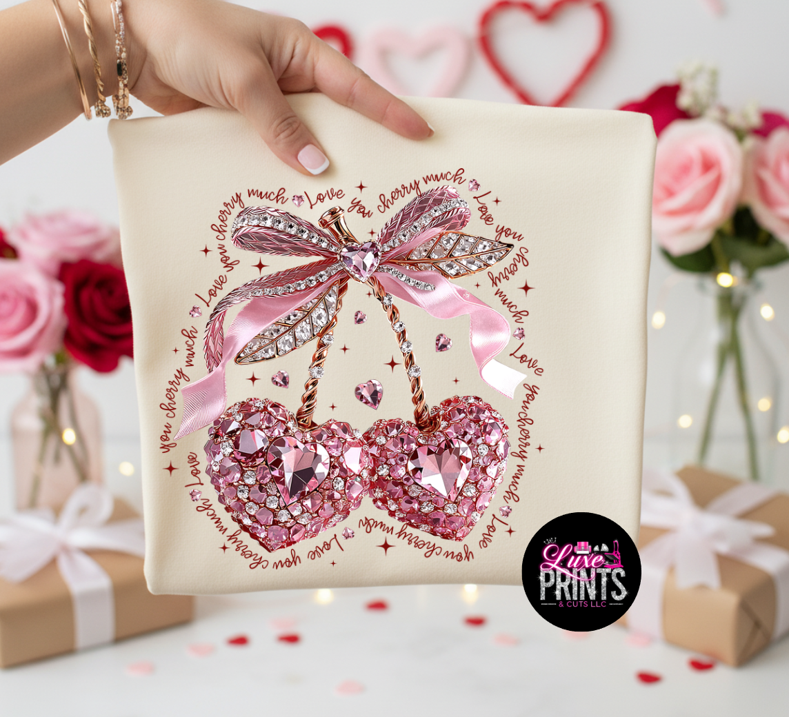 # Crystal Cherry's Elevate your Valentine's look with our exclusive crystal cherry design, now available on two premium blank options. Choose the classic durability of Gildan for everyday wear, or opt for Comfort Colors' signature pigment-dyed softness for a lived-in luxury feel. Both blanks showcase the intricate crystal cherry artwork with vibrant clarity, making this the perfect statement piece for the season. Whether you prefer structured fit or relaxed comfort, your Valentine's style awaits.