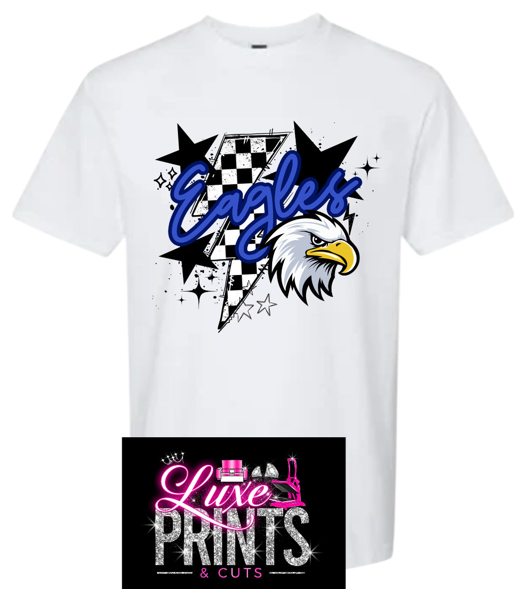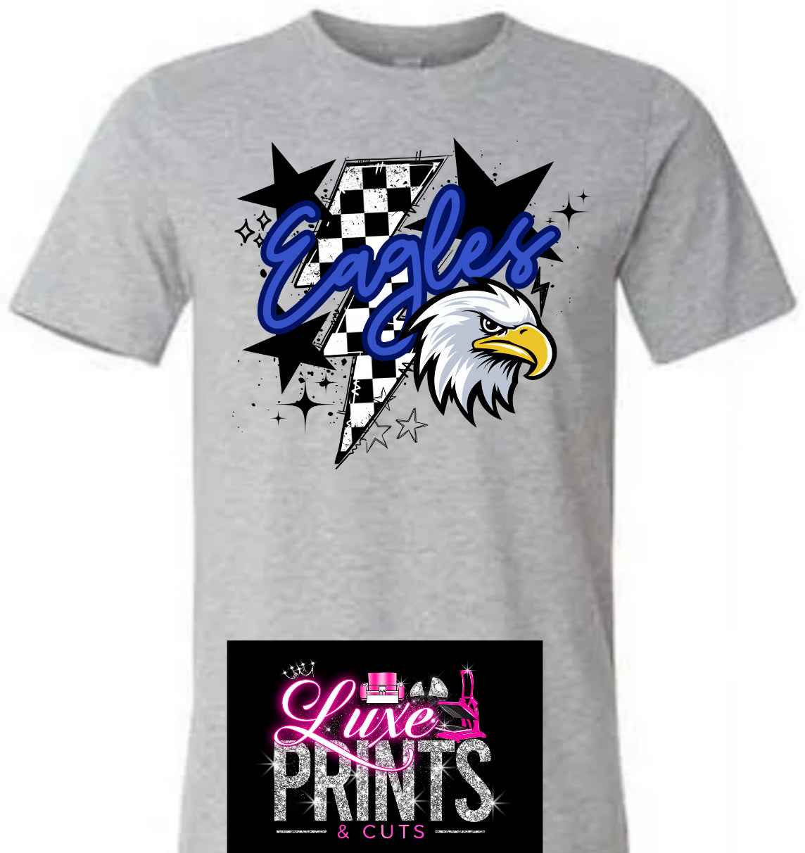 Support your school team with this unique Eagles Checkered Lighting Bolt shirt! Featuring a cute design on a Gildan brand shirt, you'll be showing off your school pride in style. Get ready to cheer on the eagles and stand out from the crowd with this must-have shirt.