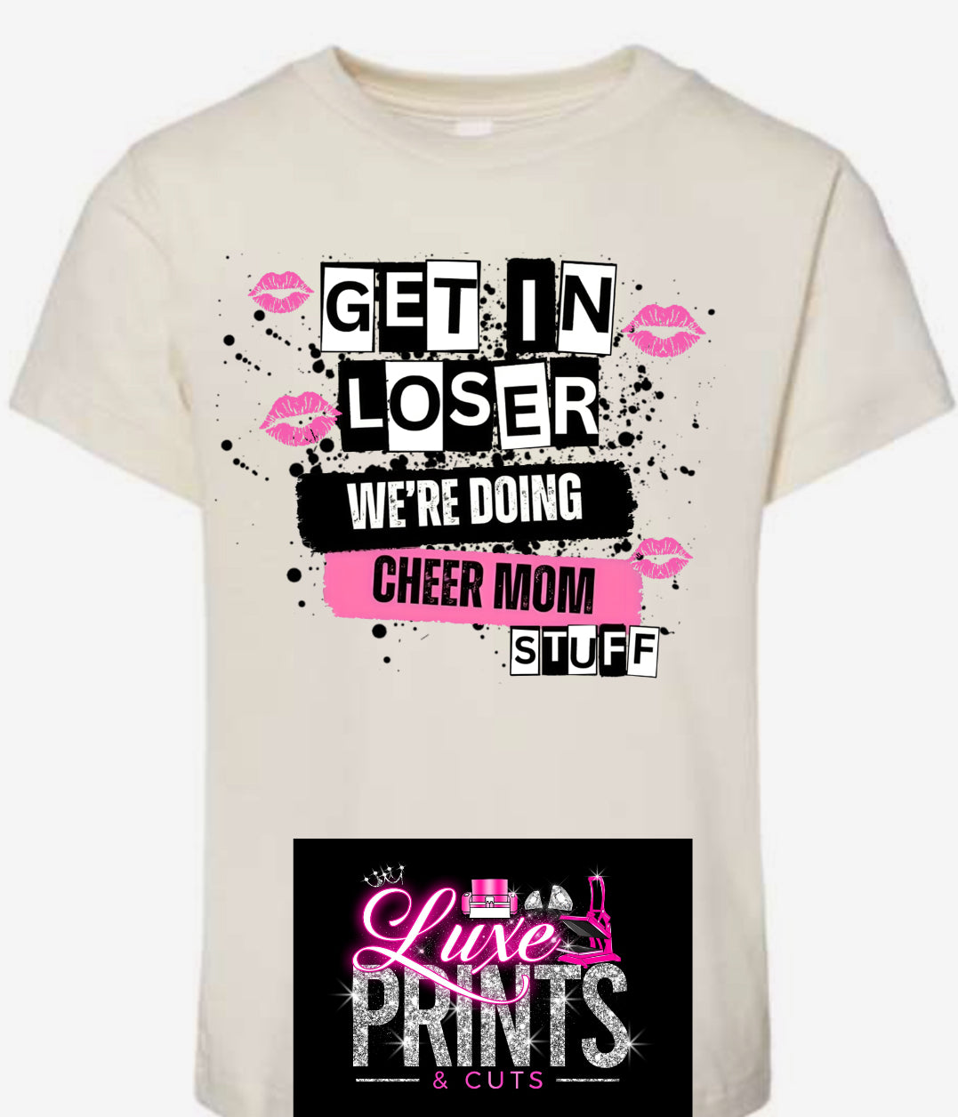 Enhance your cheer mom boss vibe with our "Get in loser" t-shirt, featuring a cute design on a Gildan brand shirt. Show off your unique style with comfort and quality you can trust. Perfect for any cheer competition or game day.